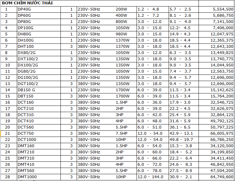 BẢNG GIÁ MÁY BƠM CHÌM NƯỚC THẢI PENTAX ITALIA MỚI NHẤT TẠI TP HÀ NỘI VÀ HCM