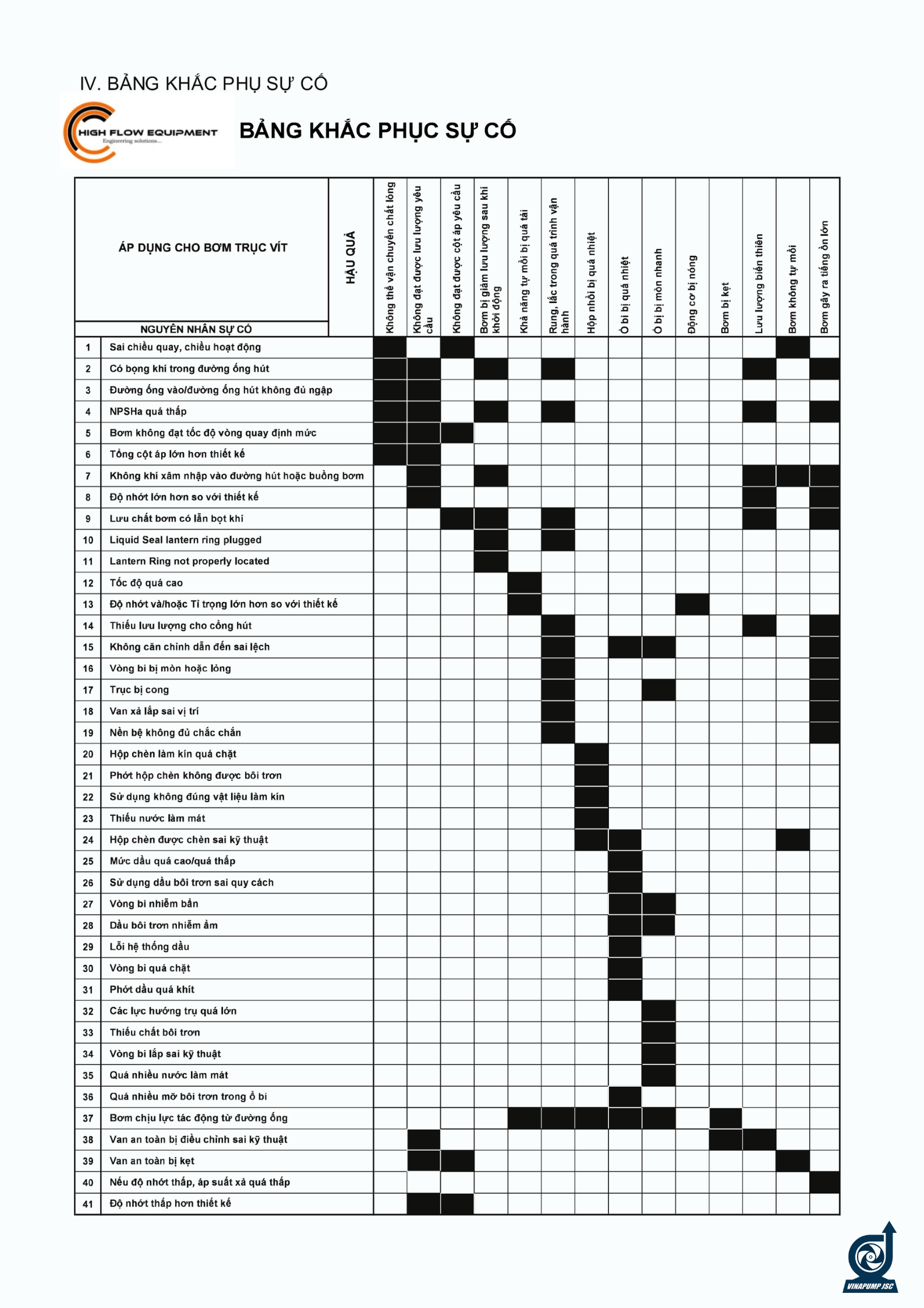 BẢNG KHẮC PHỤC SỰ CỐ BƠM TRỤC VÍT HIGHFLOW