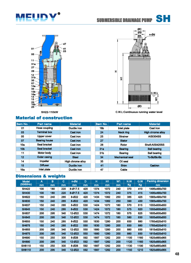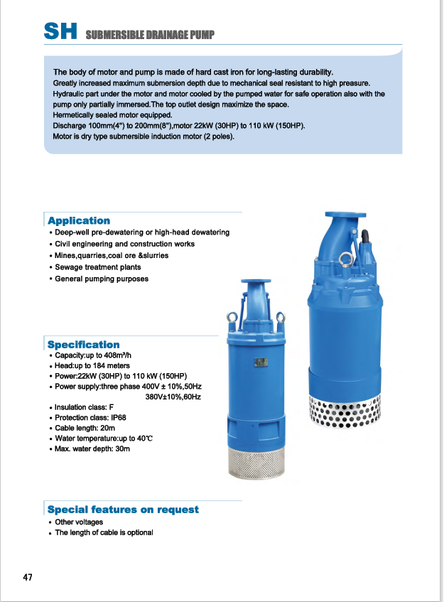 SH Là dòng máy bơm chìm cột áp cao. Thân bơm, động cơ được làm bằng Gang