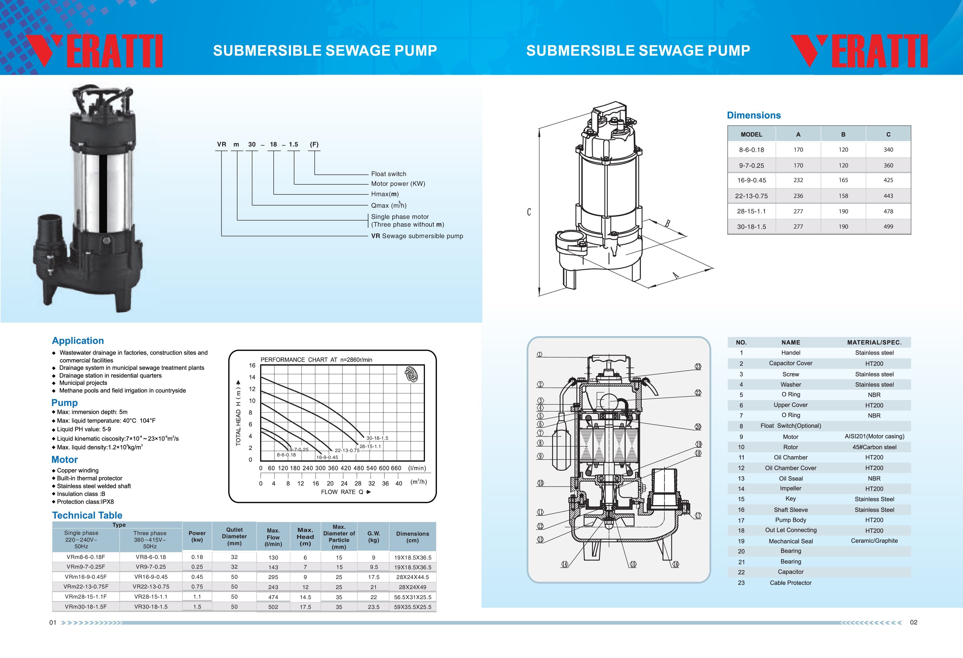 Vật liệu cấu tạo: Buồng bơm, cánh bơm bằng gang đúc (HT200), Vỏ động cơ inox ● Lớp cách nhiệt: B ● Lớp bảo vệ: IP68 ● Nhiệt độ nước: lên đến 40 ℃ ● PH: 5 -9 ● Mật độ chất lỏng: 1,3g / cm³