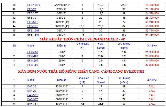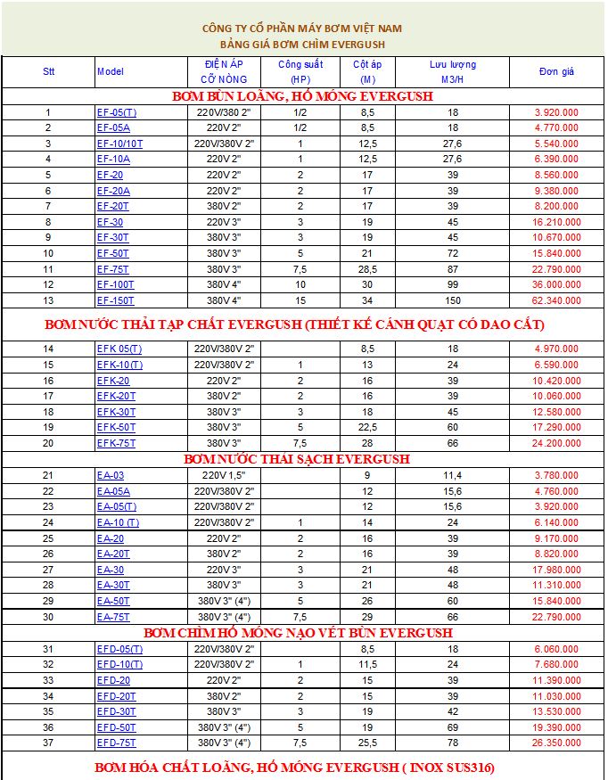 - 2. Bơm chìm nước thải Evergush - Đài Loan. Đây là thương hiệu được nhiều người ưa chuộng. bơm chìm Evergush được thiết kế cũng khá là nhỏ gọn, dễ dàng vận hành và lắp đặt, đầy đủ phụ kiện bơm chìm thuận tiện cho việc bảo dưỡng nhanh chóng. Giá bơm chìm nước thải Evergush cũng chính là ưu điểm không hề nhỏ bởi sản phẩm thuộc dòng bơm chìm nước thải Đài Loan giá rẻ nên phù hợp với nền kinh tế Việt. Các dòng bơm chìm nước thải Evergush được ưa chuộng nhất hiện nay có model là: bơm chìm nước thải Evergush EF ( bơm bùn loãng, hố móng ), bơm chìm nước thải Evergush EFK ( bơm nước thải tạp chất, cánh quạt được thiết kế có dao cắt ), bơm chìm nước thải Evergush EA ( bơm nước thải sạch ), bơm chìm nước thải Evergush EFS ( bơm hóa chất loãng ), bơm chìm nước thải Evergush EAF ( bơm nước thải, hố móng được thiết kế thân gang, cánh gang ). Cũng tùy theo mục đích dụng của người tiêu dùng mà có thể lựa chọn các mã model trên. Đặc biệt hơn, đó chính là cần phải lựa chọn địa chỉ bán máy bơm chìm nước thải Evergush uy tín nhất. Để tránh được những trường hợp lừa đảo, chặt chém giá cả, sản phẩm kém chất lượng làm hao tốn tiền bạc.