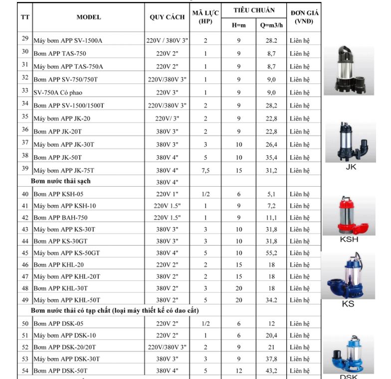 1.Bơm chìm nước thải APP- Đài Loan. Có lẽ mọi người không còn xa lạ gì đối với thương hiệu bơm này. APP sản xuất đủ các dòng máy máy bơm thị trường cần từ bơm nước trục đứng, trục ngang, bơm chịu nhiệt độ cao, bơm hóa chất, bơm bể cá, bơm chìm nước thải và giá thành của bơm cũng thuộc vào phân khúc giá rẻ.Máy bơm công nghiệp: bao gồm máy bơm chìm ADL, ADVS, DSP, JK, SV và các sản phẩm khác; máy bơm chìm DSK, GD có lẫn tạp chất; máy bơm nước thải sạch KHL, KS; máy bơm nước thải axit loãng SB; ly tâm trục ngang bằng thép không gỉ SW, SWO bơm. Các máy bơm này có công suất lớn và được thiết kế để sử dụng trong công nghiệp và công nghiệp.