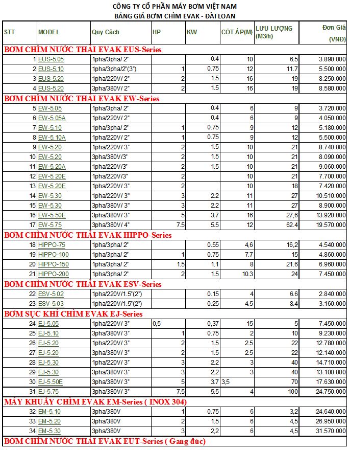 3.Bơm chìm nước thải Evak- Đài Loan. Có lẽ thương hiệu cuối cùng này ít được nhắc đến trên thị trường nhưng cũng chẳng còn xa lạ gì đối với các cán bộ trong ngành bơm cũng như các kĩ thuật lắp đặt, thi công công trình xử lý nước thải. Bơm có giá thành gần như rẻ nhất trong 3 dòng bơm giá rẻ. Hãng sản xuất nhiều dòng bơm khác nhau nhưng Việt Nam thì ưa chuộng dùng bơm chìm nước thải và máy thổi khí chìm hơn.