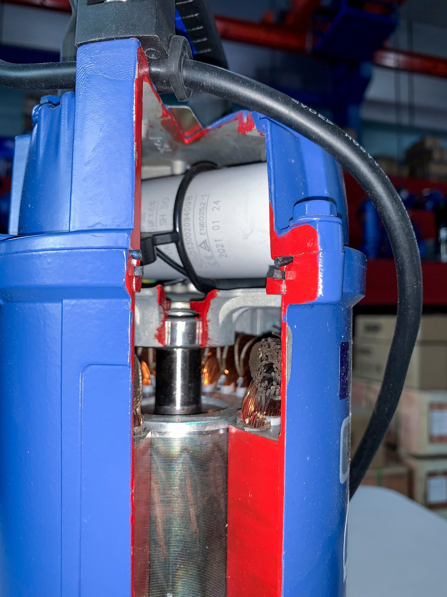 Bạn có nhận thấy điểm khác biệt so với các máy bơm ly tâm đặt cạn không? Chính là phần thân bơm hoàn toàn không có các cánh nhôm tản nhiệt cho động cơ bơm. Vì khi chìm sâu dưới nước, phần thân trơn nhẵn sẽ không cản trở dòng chảy của lưu chất. Mặt khác, thiết kế này cũng giúp bơm giải nhiệt tốt hơn nhờ dòng chảy lưu chất bơm.