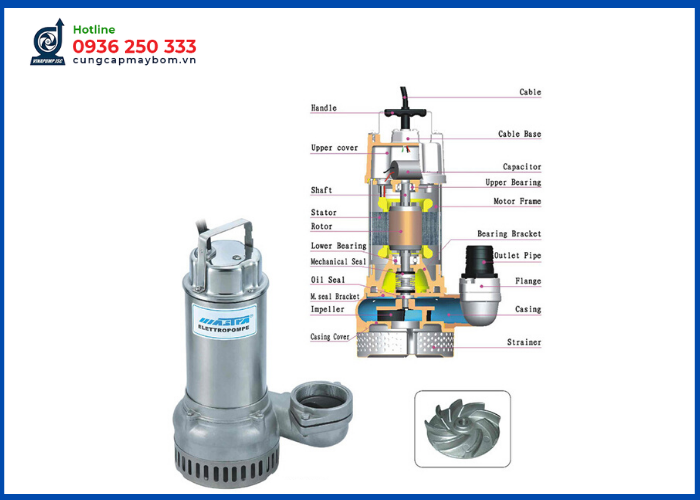 ⇒ Điểm khác biệt chính ở đây là máy bơm chìm hoàn toàn kín nước. Các bộ phận cấu tạo cơ bản thì chúng đều giống như các dòng bơm ly tâm khác, bao gồm: