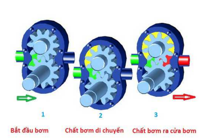Thông thường, bộ phận quay của máy bơm sẽ có 2 bánh là bánh răng và bánh lái tạo lực hút khá tốt ở đầu bơm và rút ra lại vị trí chất lỏng. Sau đó, chất lỏng được di chuyển giữa vị trí bánh răng và các bức tường của vỏ cho điểm xả. Theo đó, chất lỏng sẽ di chuyển từ vị trí đầu vào đến đầu ra, xuất hiện tụ áp suất.